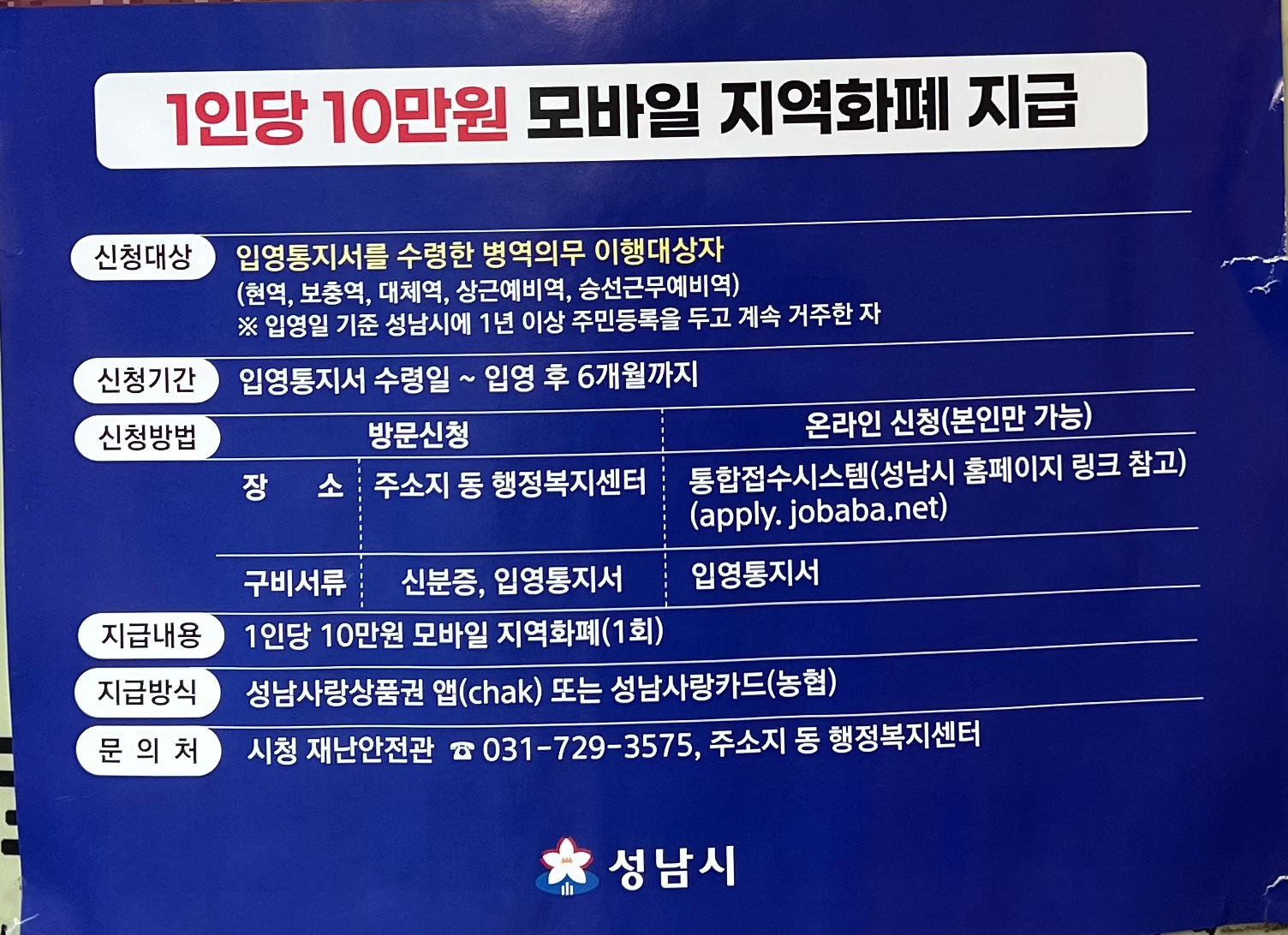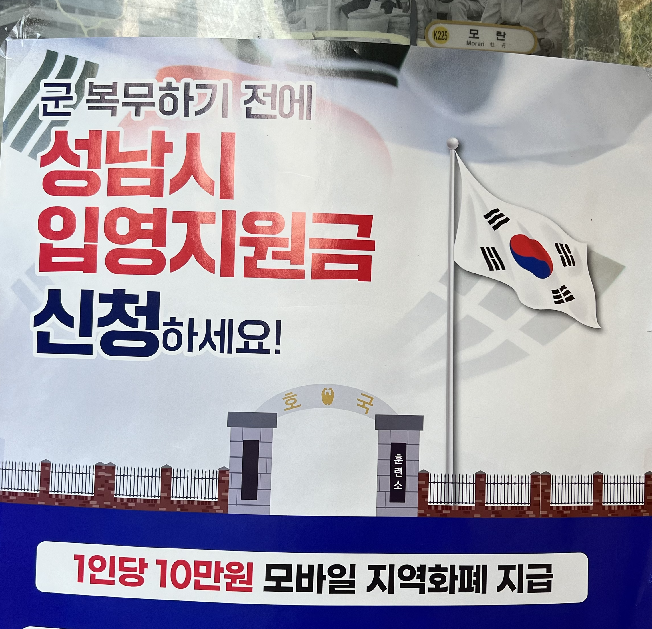 성남시 입영지원금이라고 엄청 크게 쓰여 있어서,