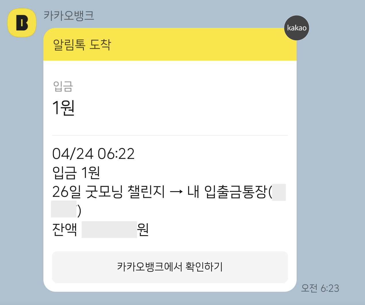 매일 아침 6-10시 사이에 카카오뱅크에