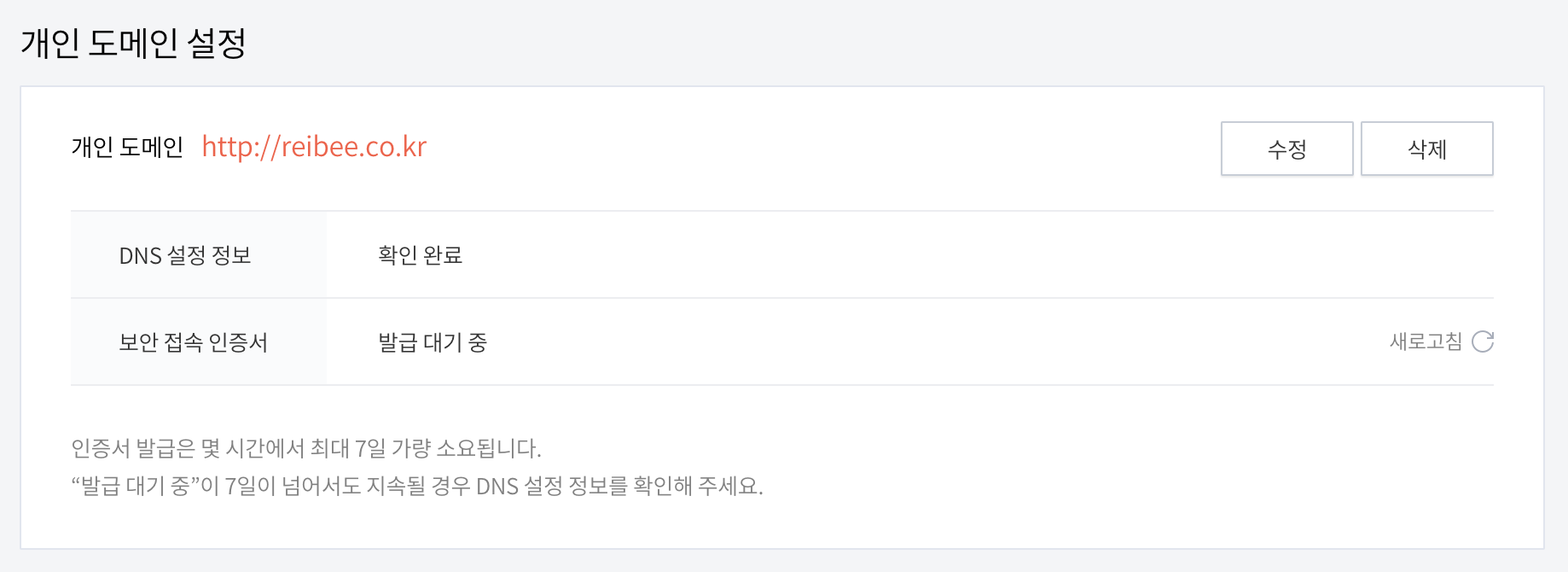 보안 접속 인증서가 발급 대기중이라고 나옵니다.